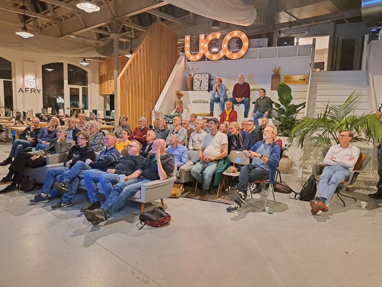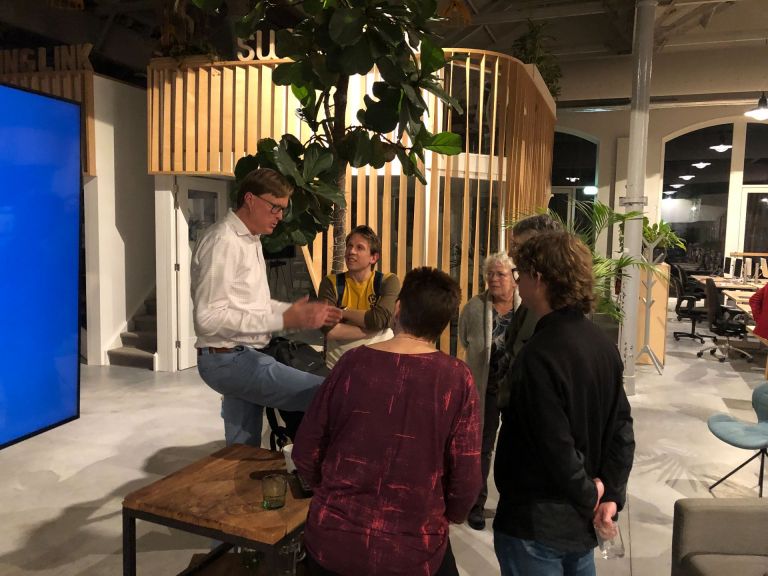 Veelzeggend beeld na afloop: een tiental bezoekers stond nog lang rondom spreker Robert Jan van Egmond. We brachten hem maar een drankje want na zijn drie kwartier presentatie kreeg hij dus nog zoveel vragen dat hij niet van zijn plek kwam. Zoveel leergierigheid in de zaal. Over mini-warmtenetten dus.