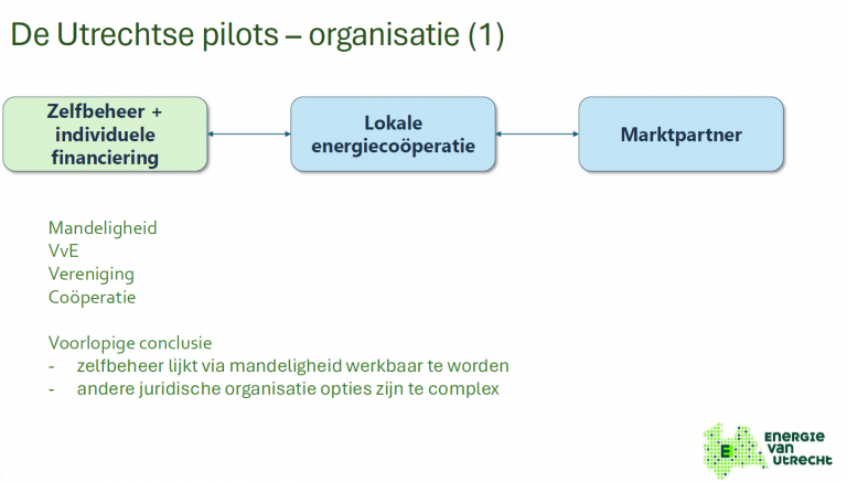 Als je die bodemlus eenmaal hebt, ben je voor een jaar of dertig wel zo’n beetje klaar. De pompen in de warmtepompen zorgen voor druk op de vloeistof zodat die blijft stromen dus er is eigenlijk geen onderhoud nodig. Er is dus eigenlijk ook geen bedrijf nodig dat bodemlus plus leidingen naar de huizen beheert of exploiteert. De juridisch meest praktische constructie om het eigendom van de lus te delen lijkt “mandeligheid” te zijn. Beter dan een VVE-constructie of een coöperatie hiervoor optuigen of gebruiken. Wel moet je de kosten opbrengen met z’n drieën en het kan handig zijn om hier wel een constructie voor op te tuigen als je de investering niet kunt of wilt opbrengen.