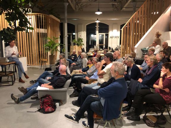 Veelzeggend beeld na afloop: een tiental bezoekers stond nog lang rondom spreker Robert Jan van…